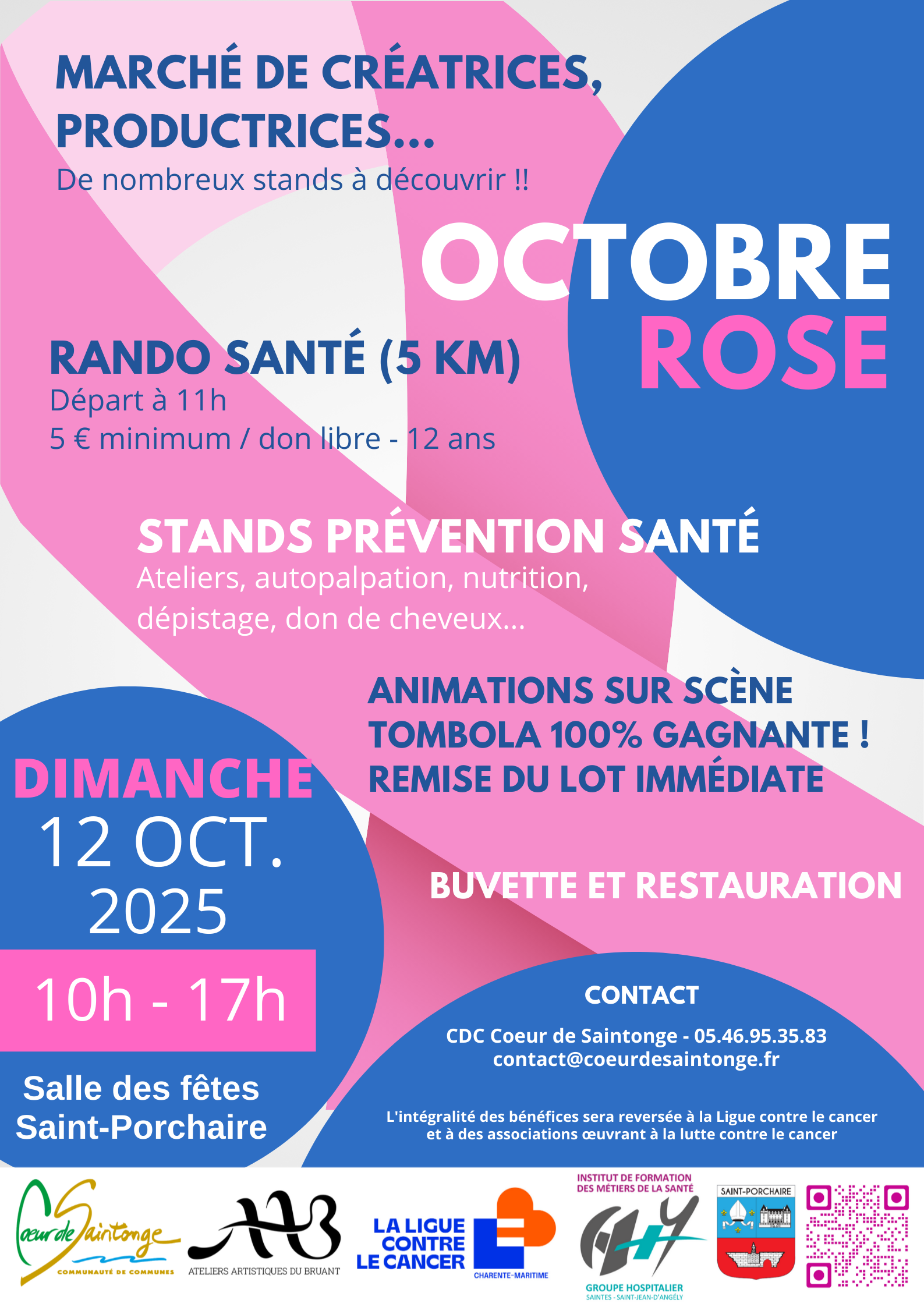 Une journée à l'honneur d'Octobre Rose qui réunira de nombreuses créatrices, productrices, artistes, autour d'un marché ouvert de 10h à 17h à la salle des fêtes de Saint Porchaire.
